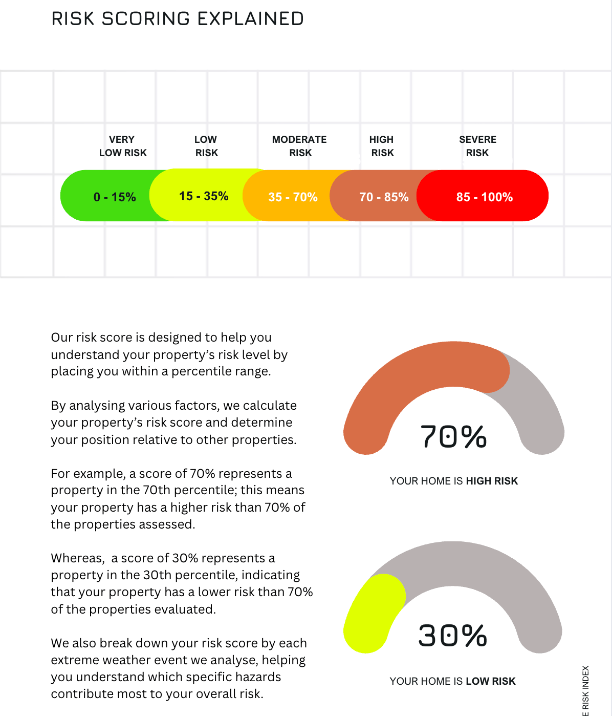 We've gathered extensive data, applied advanced climate risk modelling, and distilled the results into clear, actionable insights. Our reports provide a risk score for your property, along with a detailed breakdown of the specific risk factors identified.